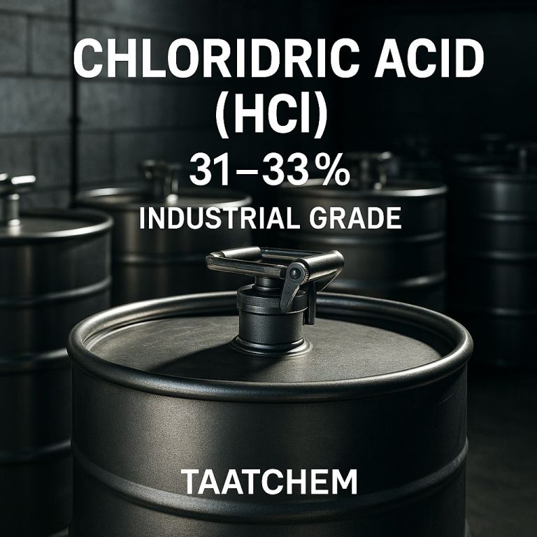 Hydrochloric Acid (HCl) is a highly important industrial chemical widely used across diverse industries such as chemicals, food processing, pharmaceuticals, and water treatment. At Taat Chem, we provide high-quality Hydrochloric Acid with 31–33% concentration, available in both bulk and 220L barrel packaging.